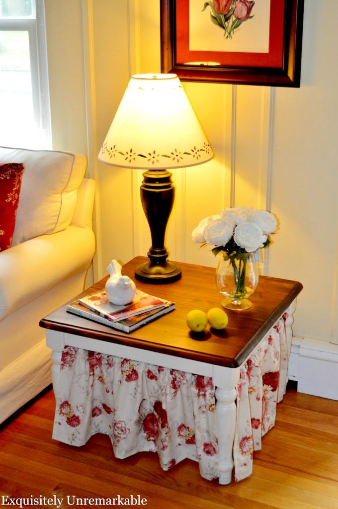In May, I decided to give my living room a bit of a makeover. I found a few new fabrics that I couldn’t resist and well, you get the story. While it is still a work in progress, I did finish the biggest makeover on my list ~ adding a skirt to an old Ikea table. I have to say, that tiny bit of fabric has dramatically changed the table and the look of the whole room. I am thrilled with the finished project and can’t believe I put it off for so long. With or without sewing skills, anyone can tackle this job in a jiffy.